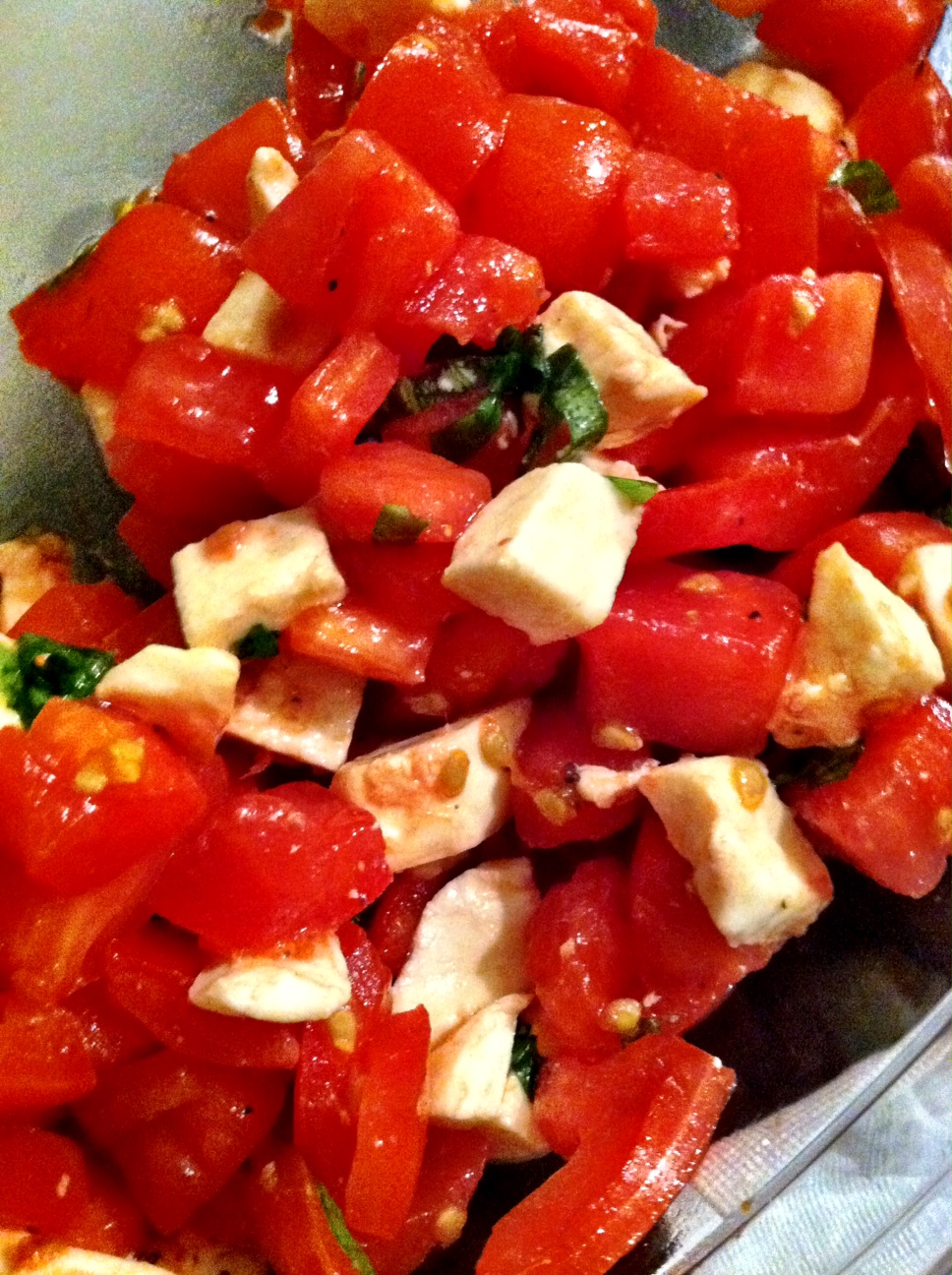 Some friends of ours invited us over for dinner this week, so I cut several tomatoes up, mixed them with diced fresh mozzarella, olive oil and fresh basil, salt and pepper and had it alongside some delicious chicken kebabs they made. Caprese is one of my very favorite tomato dishes, because it lets their freshness shine and creamy, slightly salty mozzarella is the perfect foil for them.