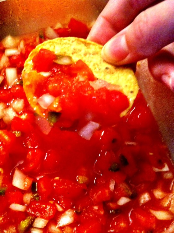 Combine all your ingredients and let sit overnight for flavors to meld. Serve fresh with tortilla chips or freeze in zip top bags or tupperware containers. When you’re ready to use, let thaw in the refrigerator overnight. When you’re ready to eat the salsa, throw in some chopped cilantro, but I wouldn’t put the cilantro in with the batch you’re freezing. I think that sort of destroys the real fresh, bright scent and taste of cilantro. If you’re not sure how to roast a pepper, there are two ways to do it depending on what you’ve got going on. If you have a gas stove, then put a small burner on low, and sit the pepper directly on the metal over the flame, rotating every minute or so until every side of the pepper is black or bubbly. If you don’t have a gas stove, place the pepper directly on your oven rack right below your broiler. Again, rotate every minute or so until each side is burnt and bubbly. Then take the pepper (regardless of roasting method) and place in a heat proof dish with a lid. Steam will build up inside the container and after 10 minutes or so, you should be able to remove the skin from the pepper with your hands – it should just slide right off. Then cut the pepper open and remove the seeds, stem and pith, then dice into salsa-sized chunks. Easy Peasy – no reason to buy roasted red peppers for like $9 a jar at the grocery store.