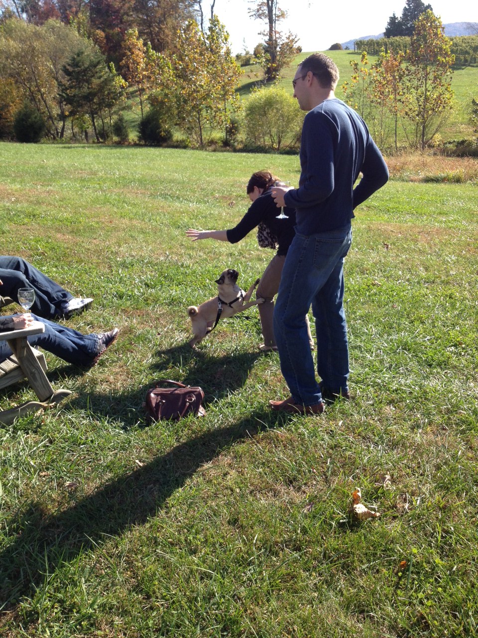 Veritas blew us all away. It was shocking to me and Jeremy because it was busier and crazier than anything we’d seen in Napa. The inside of the farmhouse style building was decorated beautifully, tastings are done in groups throughout the house – either at the bar, or in big, overstuffed leather couches, and they have a fantastic yard with a beautiful view where you can picnic or just hang out or nosh on a house cheese tray like we did. There was a line out the door to taste that never disappeared while we were there – although people were being moved through and seated pretty quickly. Far and away the star of the show here is their Saddleback Chardonnay (2011). This is an “old-world” style Chardonnay that starts in stainless steel and is matured in neutral French oak barrels for 4 months. The results is a smooth wine that is not “oakey” or buttery the way many barrel fermented Chards are. It’s light and smooth but still has a lot of body. We bought a bottle, grabbed a cheese tray and set up camp for a while. And wouldn’t you know it, I found the only pug visiting wineries that day in Shenandoah?