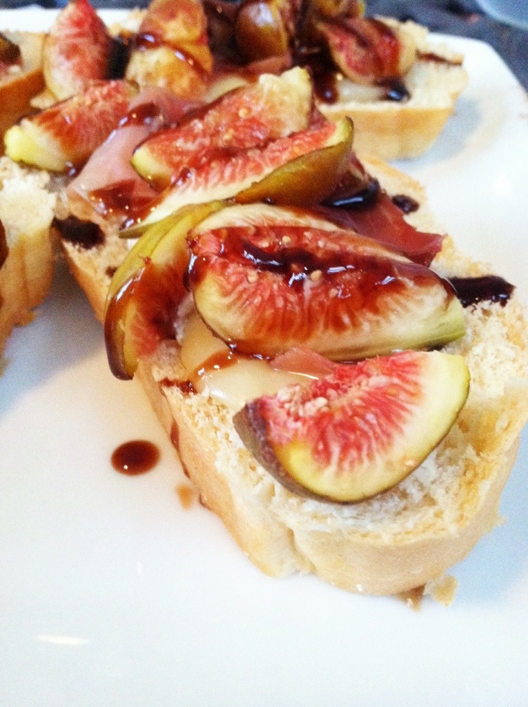 Toast slices of French bread at 375 for a few minutes until they are just lightly toasted. Remove from oven and top each slice with a thin slice of Brie. Spread the Brie gently as not to tear the bread. Top the Brie with a thin slice of prosciutto and quartered fresh figs. Return to the oven and toast until cheese is soft and beginning to melt. Remove from oven and drizzle with balsamic glaze.