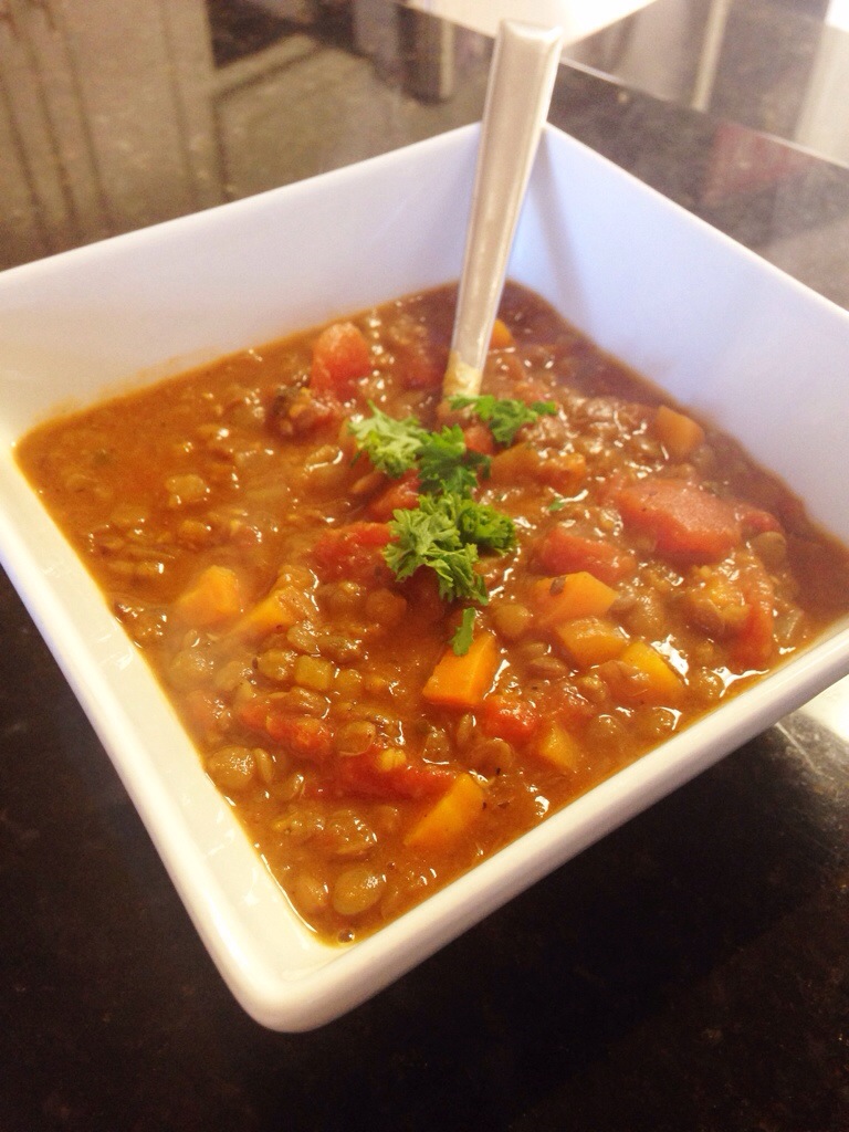 One of the best things about working from home is being able to make myself lunch every day. Like, really make something, not just a sandwich. Today I made a curried carrot and lentil soup. I picked up some carrots at Bergey’s Breadbasket Produce in Chesapeake yesterday and I also had some left over lentils from dinner last night that were already cooked. I sautéed some onion, garlic and three medium carrots in olive oil, curry powder, salt, pepper, oregano, fresh parsley and a dash of coriander. When they were tender I threw in a dash of red wine and balsamic vinegar and let that reduce, then added a can of stewed tomatoes with their juice – roughly chopped and let that simmer for 20 minutes. Then I added a cup of homemade chicken broth and let simmer another ten minutes and finally added about a cup and a half of cooked lentils, stirring to combine well. Let this simmer until warmed through and the carrots are tender but not mushy. Serve with more fresh parsley and cayenne pepper (if you’re a heat freak like me). Now that’s lunch!